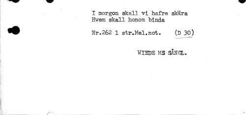 //// I morgon skall vi hafre skära //// Hwem skall honom binda //// Nr.262 1 str.Mel.not. (D 30) //// * //// WIEDE MS SÅN (3,. //// T //// j //// ! //// - //// i //// j //// _ \ _ _ _ ////