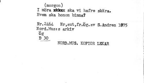 //// ^ morgon; //// I nSra xkkax ska vi hafre skära. //// Hvem ska honom binna? //// Nr.2464 Nr,autyfr.Og.av S.Andren 1975 //// Nord.Mus:s arkiv //// og //// D 30 //// NORD.MUS. KOPIOR LEKAR //// ! //// i //// i //// < //// : ////