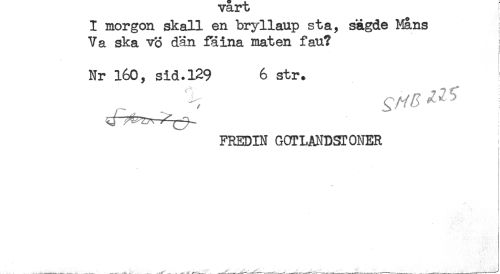 //// f //// I morgon skall en bryllaup sta, sagde Mans //// Va ska vo dän faina maten fau? //// Nr 160, sid.129 6 str. //// FREDIN GCTLANDSTONER //// i //// i ////
