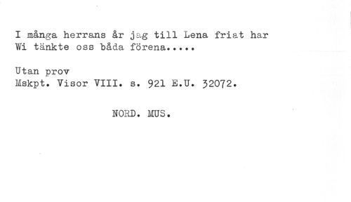 //// I många herrans år jag till Lena friat har //// Wi tänkte oss "båda förena..... //// Utan prov //// Mskpt. Visor VIII. s. 921 E.U. 32072. //// NORD. MUS. ////