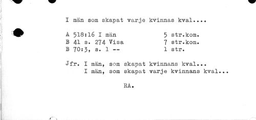 //// if //// I män som skapat varje kvinnas kval.... //// A 518:16 I män 5 str.kom. //// B 41 s. 274 Visa 7 str.kom. //// ! B 70:3, s. 1 — 1 str. //// Jfr. I män, som skapat kvinnans kval... //// I män, som skapat varje kvinnans kval... //// RA. //// ......\ ////