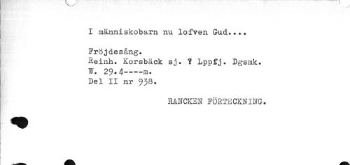 //// I människobarn nu lofven Gud.... //// } //// Fröjdesång. //// Reinh. Korsbäck sj. ? Lppfj. Dgsmk. //// W. 29.4----m. //// Del II nr 938. //// RANCKEN FÖRTECKNING. //// t //// v ////