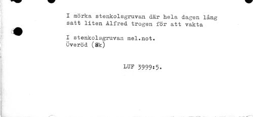 //// I mörka stenkolsgruvan där hela dagen lång //// satt liten Alfred trogen för att vakta //// * //// I stenkolsgruvan mel.not. //// Överöd (äk) //// LUF 3999:5. ////