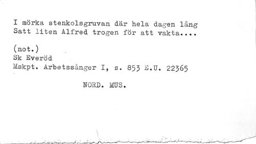 //// I mörka stenkolsgruvan där hela dagen lång //// Satt liten Alfred trogen för att vakta.... //// (not.) //// Sk Everöd //// Mskpt. Arbetssånger s. 853 E.U. 22365 //// NORD. ms. //// \ ////