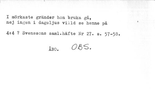 //// I mörkaste gränder hon bruka gå, //// nej ingen i dagsljus villd se henne på //// 4?4 ? Svenssons saml.häfte Nr 2?. s. 57-58. //// iBO. ^åS* ////