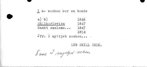 //// t. //// n- socken bor en bonde //// * a) b) 1846 //// Hållkarlsvisa 1847 //// Raskt samloms... 1847 //// 1854 //// Jfr. 1 nyttjet socken... //// LUB SKILL UNIK. //// L. ______ ////
