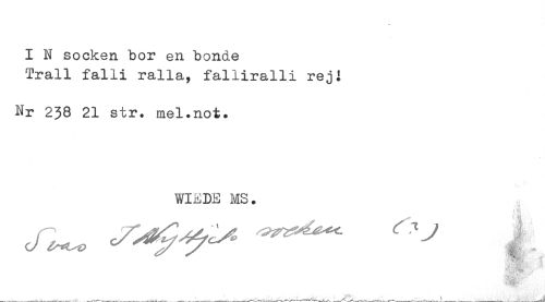 //// I N socken bor en bonde //// Trall falli ralla, falliralli reji //// Nr 238 21 str. mel.not. //// WIEDE MS. //// HB ////