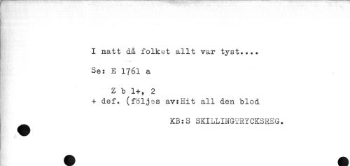 //// I natt då folket allt var tyst.... //// Se: E 1761 a //// H - //// Z b 1+, 2 //// + def. (följes av:Hit all den blod //// KB:S SKILLINGTRYCKSREG. ////
