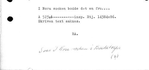 //// j //// I Nora socken "bodde det en fru.... //// ' ^ A 523t^------insp. Rtj. 14384^86. //// ^^ Skriven text saknas. //// 'w' //// RÅ. //// L______ / \ ////