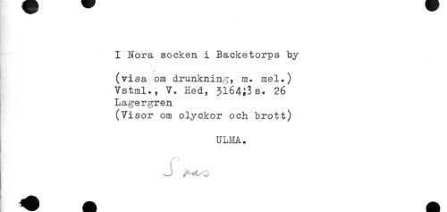 //// IHH^^ - //// I Nora socken i Backetorps by //// (visa om drunkning, m. mel.) //// Vstml., V. Hed, 3l64;3s. 26 //// Lagergren //// (Visor om olyckor och brott) //// ULMA. //// ; J ^tc ////