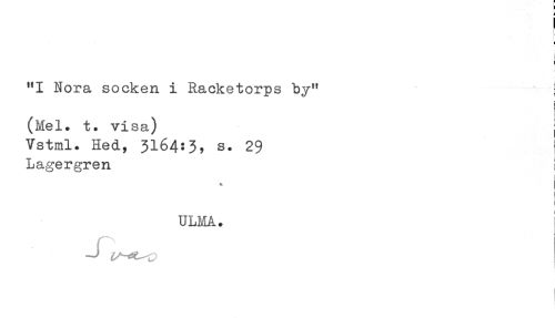//// "I Nora socken i Racketorps by" //// i //// (Mel. t. visa) j //// Vstml. Hed, 3164:3, s. 29 //// Lagergren ! //// 1 //// * //// ! //// ULMA. //// j ////