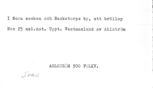 //// I Nora socken och Backetorps by, ett bröllop //// N:o 25 mel.not. Uppt. Vestmanland av Ahlström ; //// i //// i //// AHLSTRÖM 300 FOLKV. ////