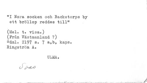 //// "I Nora socken och Backetorps by //// ett bröllop reddes till" //// (Mel. t. visa.) //// (Från Västmanland ?) //// Sdml. 2197 s. 7 a,b, kaps. //// Ringström A. //// ULMA. //// ___ ______._____._______^_______^^ ////
