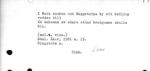 //// I Nora socken och Baggetorpa by ett bröllop //// ] reddes till //// ! En änkeman av sämre stånd brudgumme skulle //// bli. //// (mel.å. visa.) //// Sdml. Åker, 2381 s. 13. //// Ringström A. //// ^ ULIÉA. //// ^^^ ^ ^ - ////