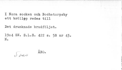 //// I Nora socken och Bochetorpsby //// ett bröllpp redes till //// Det drunknade brudföljet. //// 19:4 SN. S.L.S. 422 s. 58 nr 43. //// N. //// t //// ÅBO. //// i //// i ////