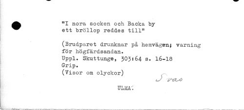//// ^^ "I nora socken och Backa by //// ^^ ett bröllop reddes till" //// (Brudparet drunknar på hemvägen; varning //// för högfärdsandan. //// Uppl. Skuttunge, 303:64 s. 16-18 //// Grip. //// (Visor om olyckor) ////