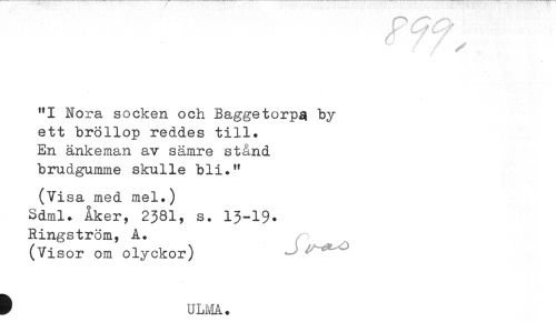 //// "I Nora socken och Baggetorpa by- //// ett bröllop reddes till. //// En änkeman av sämre stånd //// brudgumme skulle bli." //// (Visa med mel.) //// Sdml. Åker, 2381, s. 13-19* //// Ringström, A. //// (Visor om olyckor) //// H) TIT.MA ////