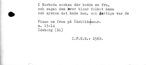 //// I Norboda socken dar bodde en fru, //// och sagan den &ver bland folket ännu //// och syskon det hade hon, och fattiga var de //// Visan om frun på Odsköldsjmoar. //// s. 13-14 //// Ödeborg (Dl) //// I.F.G.H.: 1562. //// j //// * s //// / //// H / \ ^ ////