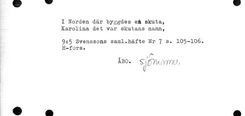 //// I Norden där byggdes e& skuta, //// Karolina det var skutans namn, //// 9:5 Svenssons saml.häfte Nr 7 s. 105-106. //// H-fors. //// ÅBO. ////