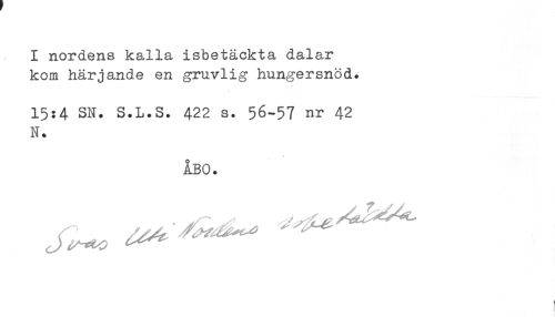 //// I nordens kalla isbetäckta dalar //// kom härjande en gruvlig hungersnöd. //// 15:4 SN. S.L.S. 422 s. 56-57 nr 42 //// N. //// ÅBO. ////