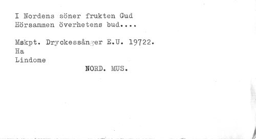 //// I Nordens söner frukten Gud //// Hörsammen överhetens bud.... //// Mskpt. Dryckessånger E.U. 19722. //// Ha //// Lindome //// NORD. ms. //// ........._........ ........ / ////