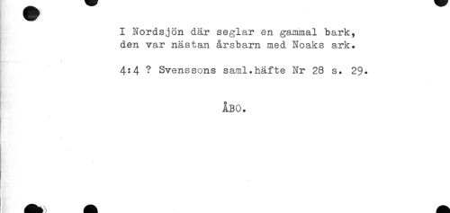 //// I Nordsjön där seglar en gammal bark, //// den var nästan årsbarn med Noaks ark. //// 4:4 ? Svenssons saml.häfte Nr 28 s. 29. //// ÅBO. //// * //// * ////