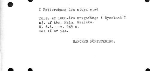 //// I Pettersburg den stora stad //// förf. af 1808-års krigsfånge i Ryssland ? //// sj. af Abr. Malm. Maalaks. //// W. 6.8. - v. 945 m. //// Del II nr 944- //// RANCKEN FÖRTECKNING. //// ! ////