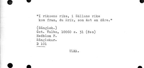 //// "I riksens rike, i Sällans rike //// kom fram, du Erik, som äst en dåre." //// (Sånglek.) //// Gst. Valbo, 10060 s. 31 (8:0) //// Hedblom F. //// Sånglekar. //// D 101 //// ULMA. ////