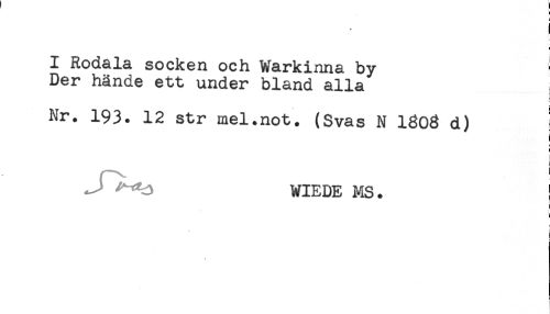 //// i //// I Rodala socken och Warkinna by //// Der hände ett under bland alla //// : //// Nr. 193. 12 str mel.not. (Svas N 1308 d) //// -- ^^ WIEDE MS. ! //// ) //// j //// E ////