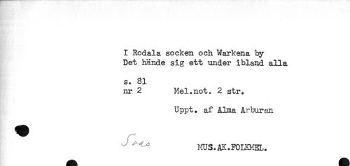 //// I Rodala socken och Warkena ty //// Det hände sig ett under ibland alla //// - //// s. 81 //// nr 2 Mel.not. 2 str. //// Uppt. af Alma Arburan //// ^ ^^ MUS.AK.FOLKMEL. ////