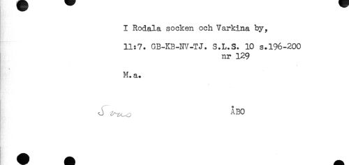 //// I Rodala socken och Varkina by, //// 11:7. GB-KB-NV-TJ. S.L.S. 10 s.196-200 //// nr 129 //// M.a. //// <j ÅBO ////