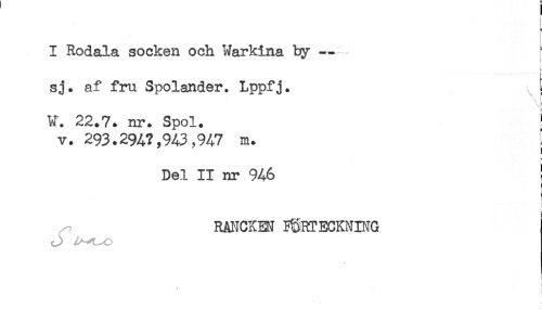 //// I Rodala socken och Warkina by — //// sj. af fru Speländer. Lppfj. ! //// W. 22.7. nr. Spol. //// v. 293.2%?,%3,%7 m. ' //// ! //// Del II nr 9A6 ! //// < //// : //// RAIICKEN BETECKNING //// o) ^L^O //// i //// '< ! ////