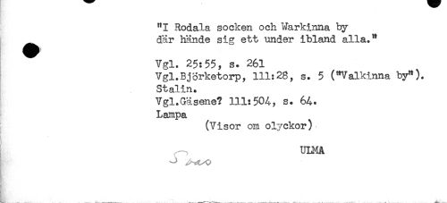 //// "I Rodala socken och Warkinna by //// ^^ där hände sig ett under ibland alla." //// Vgl. 2$:55, s. 261 //// Vgl.Bjorketorp, 111:28, s. 5 ("Valkinna by"). //// Stalin. //// Vgl.Gäsene? 111:504, s. 64. //// Lampa //// (Visor om olyckor) //// ! r-i ULMå ////