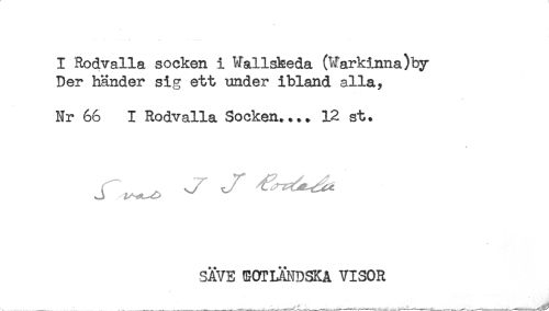//// I Rodvalla socken i Wallskeda (Warkinna)by //// Der händer sig ett under ibland alla. //// Nr 66 I Rodvalla Socken.... 12 st. //// SÄVE EOTLÄNDSKA VISOR ////