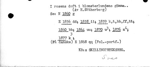 //// I rosens doft i blomsterlundens gömma.. //// (Av H.Sätherberg) //// ^ Se: N 1860 g //// E 1856 dd; l82Lii;_l859.k,t,bb,ff,tt; //// 1860 bb; 186A uu; 1870 u^; 1876 n*S //// 3 //// 1877 k ; //// (På*nnske) E 1868 qq (Fol.-portf.) //// KB:s SKILLINGTEYCKSREG. //// L . . - ... . - . .. , i' ////