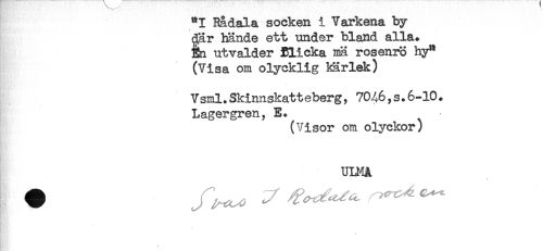 //// "I Radala socken i Varkena by //// d^r hände ett trnder bland alla. //// En utvalder Klicka mä rosenrö hy" //// (Visa om olycklig Mar lek) //// * //// Vsml.Skinnskatteberg, 7046,s.6-10. //// Lagergren, E. //// (Visor om olyckor) //// - //// ULMA ////