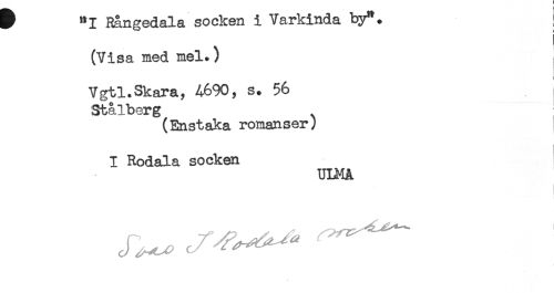 //// ^ "I Rangedala socken i varxinaa oy. ; //// (Visa med mel.) ; //// ! //// Vgtl.Skara, 4690, s. 56 //// Stålberg //// (Enstaka romanser) //// I Rodala socken //// ULMA ////