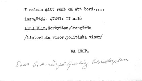 //// I salens mitt runt om ett bord..... //// insp,Rtg*, 47231: II n.l6 //// * //// Lind. Elin. Norhytt an, Grangärde //// /historiska visor,politiska visoi/ //// RA INSP. ////