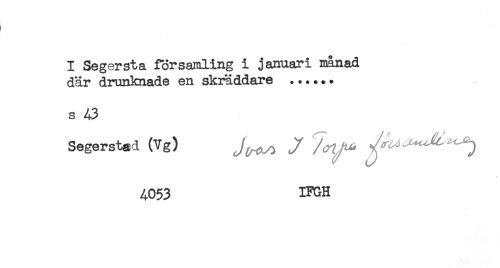 //// I Segersta församling i januari månad //// där drunknade en skräddare ...... //// s 43 //// Segerstad (Vg) J ^ / //// \ //// 4053 IF^H ////