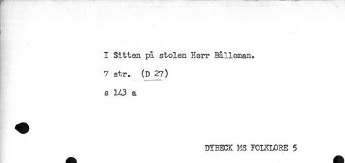 //// ty //// I Sitten på stolen Herr Bålleman. //// 7 str. (D 27) //// s 143 a //// * //// DYBECK MS FOLKLORE 5 ////
