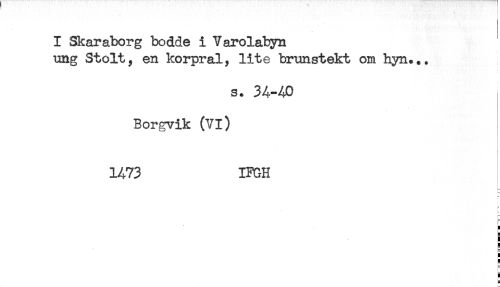 //// I Skaraborg bodde i Varolabyn //// ung Stolt, en korpral, lite brunstekt om hyn... //// s. 34-40 //// Borgvik (VI) //// i //// 1A73 IFGH //// < //// t— //// r //// ! //// i //// - ////