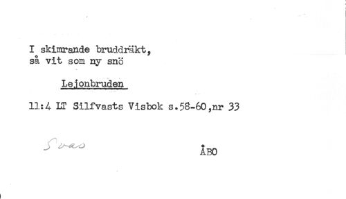 //// I skimrande bruddräkt, //// så vit som ny snö //// Lejonbruden //// 11:4 LT Silfvästs Visbok s.58-60,nr 33 //// ^ ^ ABO ////