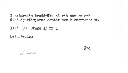 //// I skimrande bruddräkt så vit som en sno //// Stod djurtäm järns dotter den blomstrande mö //// 11:A DB Brage 13 nr 1 //// Lej onbruden //// ÅBO ////