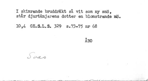 //// I skimrande bruddräkt så vit som ny sno, //// står djurtämjarens dotter en blomstrande mo. //// 10,4 GE.S.l.S. 329 s.73-75 nr 68 //// ÅBO //// 1 .f ////