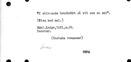//// skimrande bruddräkt så vit som en sno", //// (^isa med mel.) //// Sdml.Ludgo,748l,s.29. //// Dencker. //// (Enstaka romanser) //// UBMA ////