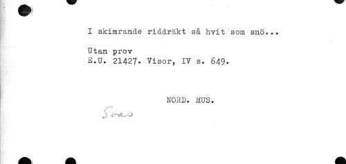 //// I skimrande riddräkt så hvit som snö... //// Utan prov //// E.U. 21427. Visor, IV s. 649. //// NORD. MUS. //// ' //// 'tf** ////