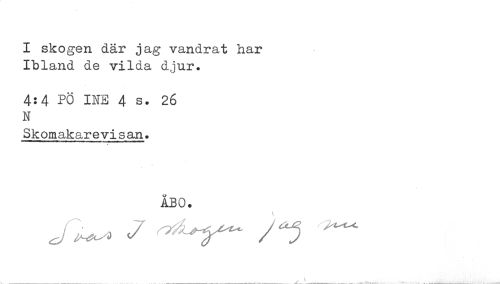 //// I skogen där jag vandrat har //// Ibland de vilda djur. //// 4:4 PO INE 4 s. 26 //// N //// Skomakarevisan. //// ÅBO. //// <7 ^^ ^ //// _ ___ ^ \ _^ _ ' ___ ////