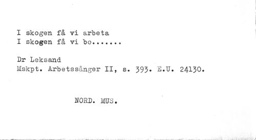 //// ! //// < //// t //// I skogen få vi arbeta ' //// I skogen få vi bo....... //// Dr Leksand //// Mskpt. Arbetssånger II, s. 393. E.U. 2413O. //// NORD. MUS. ////