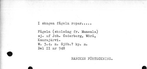 //// I skogen fågeln ropar..... //// - //// Fågeln (skolsång fr. Munsala) //// sj. af Joh. Cederborg, Wörå, //// Kaurajärvi. //// W. 3*4* R. Sjöb.? kp. m. //// Del II nr 948 //// ^ RAI^CKEN FÖRTECKNING. ////