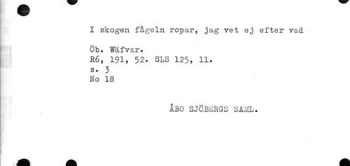 //// I skogen fågeln ropar, jag vet ej efter vad //// : Ob. Wäfvar. //// R6, 191, 52. SLS 125, 11. //// s. 3 //// No 18 //// ÅBO SJÖBERGS SAML. //// < //// K //// L ////